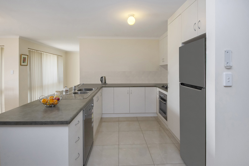 * Roomy modern kitchen with stainless steel appliances and dishwasher.