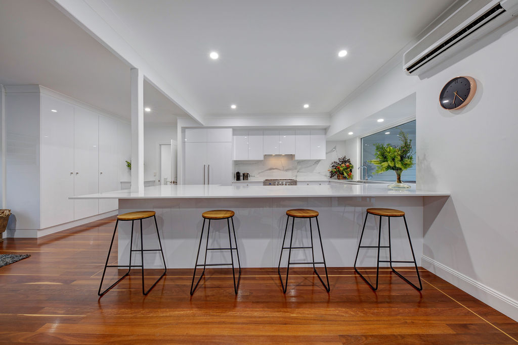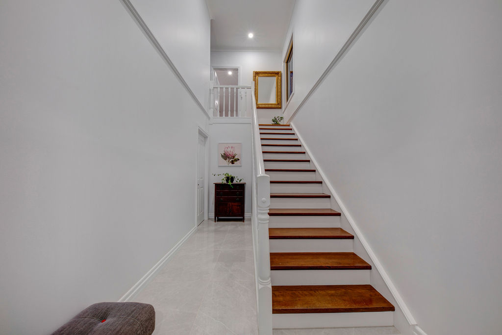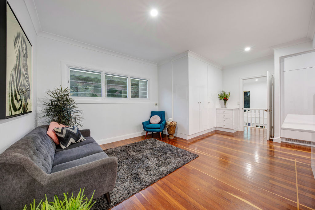 The heart of this house is an absolute chefs paradise. The timeless design featuring gas cook tops, and a sleek integrated fridge/freezer complement the never-ending prep space and storage space. The relaxed dining area leads to the vast and beautifully crafted deck which has been extended with entertaining the focus of the design brief. This east facing deck offers supreme privacy, shade and an abundance of space with access to the front of the property via the double wide staircase.