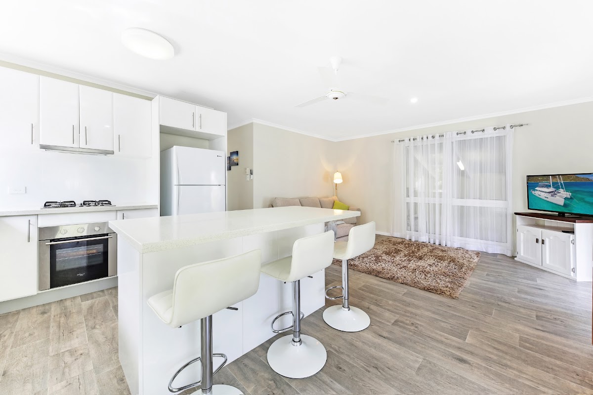 There are 2 bedrooms and the main bedroom has 2 built in wardrobes for storage and includes a very much new matress and bedsides. The 2nd bedroom is smaller but includes a trundle bed that folds out into a double bed. The main living, kitchen and second bedroom of the home features the new timber look vinyl planks plus the modern kitchen featuring stone bench tops and stainless steel appliances including gas cook top and purpose built island bench for ease of entertaining not to mention the abundance of bench and cupboard space throughout all taking in the views through the bay window which features an electric roller shutter for security when away.