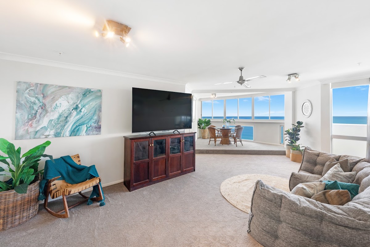 Perched on the 24th floor of the prestigious Focus building, this spacious apartment offers breathtaking, uninterrupted ocean views from all of its balconies. Situated directly opposite lifeguard tower 35 and just a mere 10-second walk to the beach, you’ll enjoy the tranquility of coastal living with the added convenience of being only 400 meters from the bustling Cavill Avenue—perfectly placed to embrace both peace and proximity to the action.
