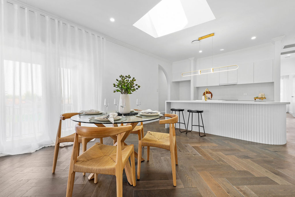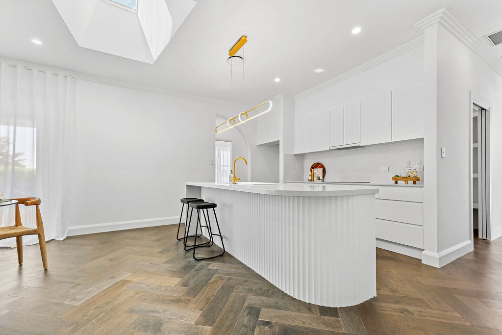 * Generous living room and open-plan kitchen, aglow with natural light from a skylight