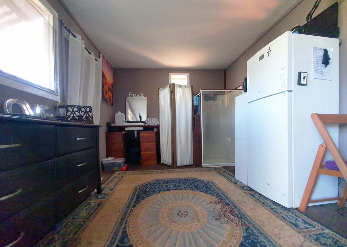 The bush hut has a bush toilet and shower. Fridge and lights are powered by solar panels.