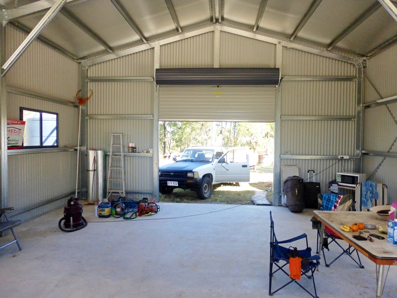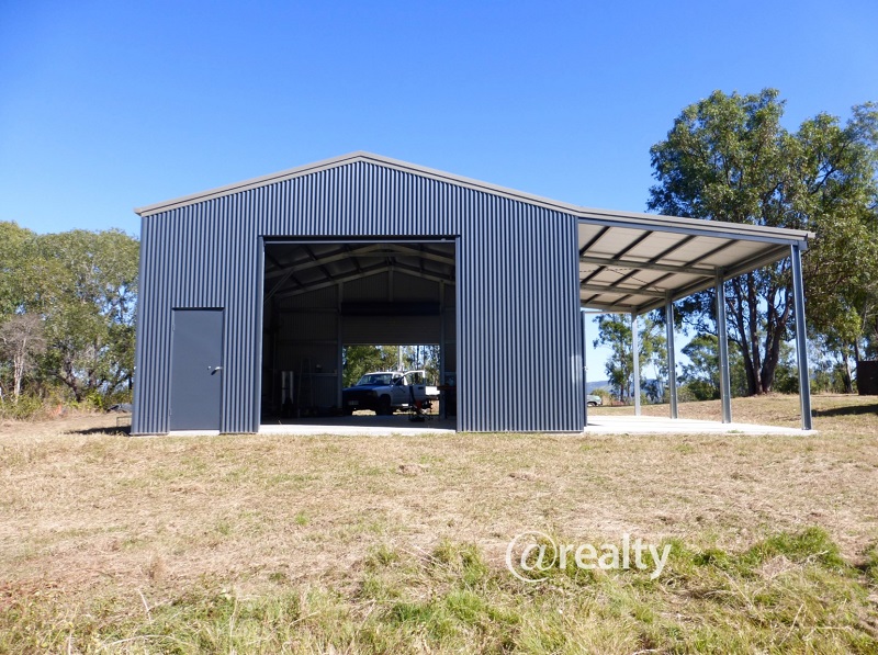 The near new Colorbond shed measures 9m x 7.5m with 9m x 4m awning with a height of 4.8m. A 3.5m high electric roller door and two 3m roller doors. The floor is concrete and electricity is connected. 7000gal rainwater tank plus 8000gal header tank.